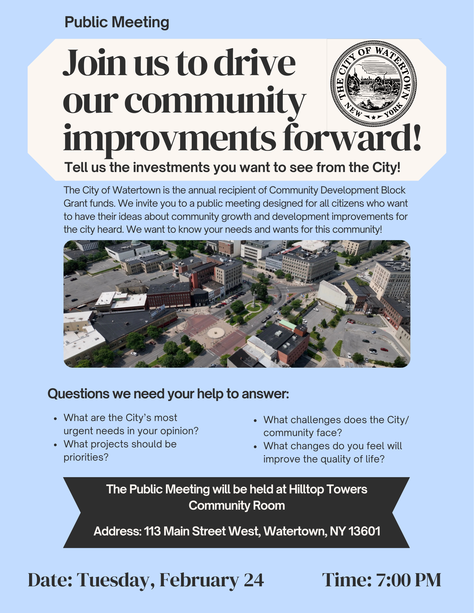 We invite you to a public meeting designed for all citizens who want to have their ideas about community growth and development improvements for the city heard. The City of Watertown is the annual recipient of Community Development Block Grant funds. Information about funding, interactive group communications, and refreshments are all on the agenda for this year’s Public Meeting. Please take our survey by clicking here.